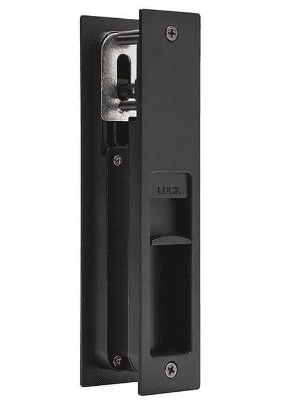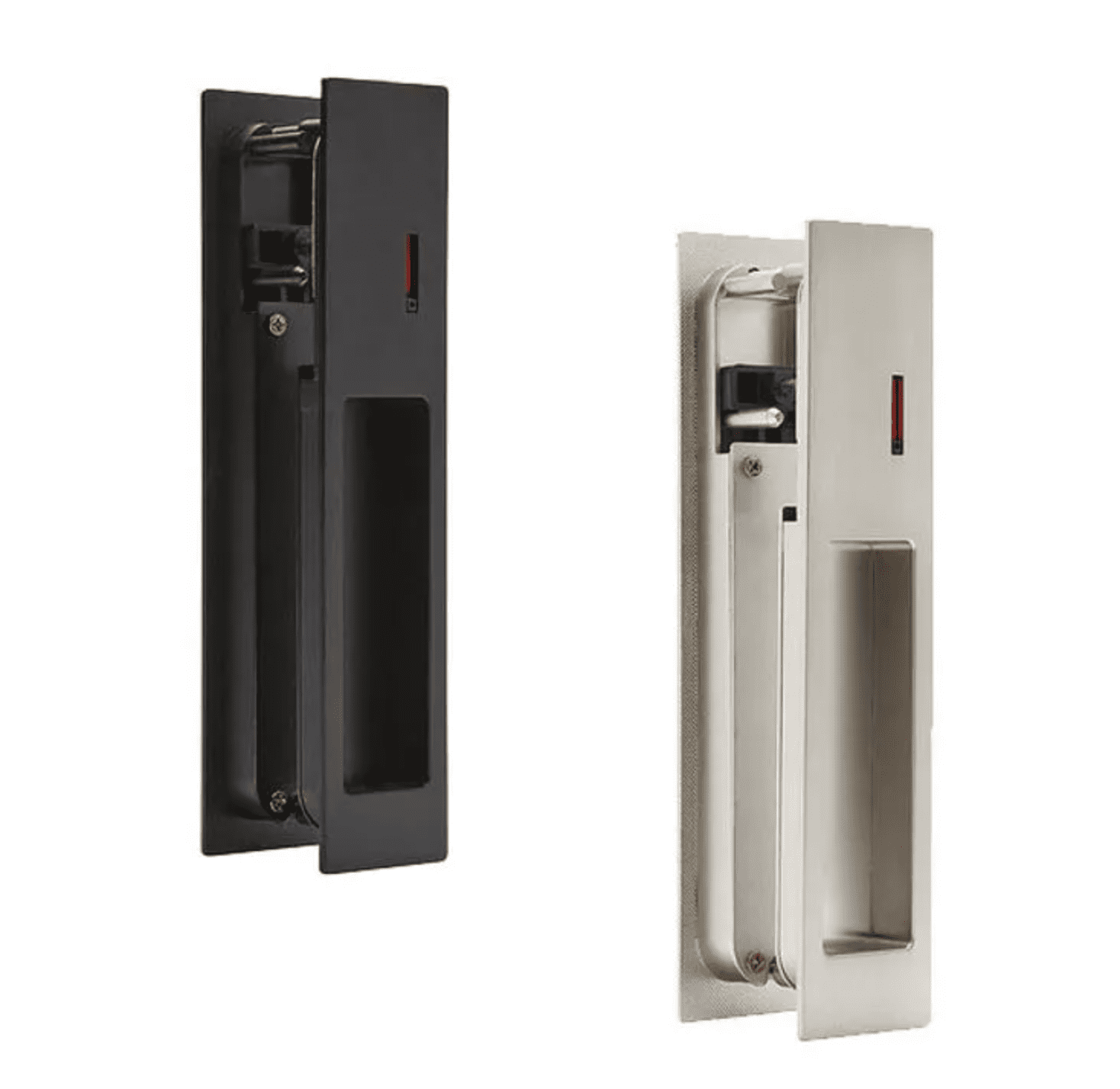 Unlike traditional handles, this recessed privacy lock sits flush within the door panel. That makes it ideal for tight pocket door cavities.